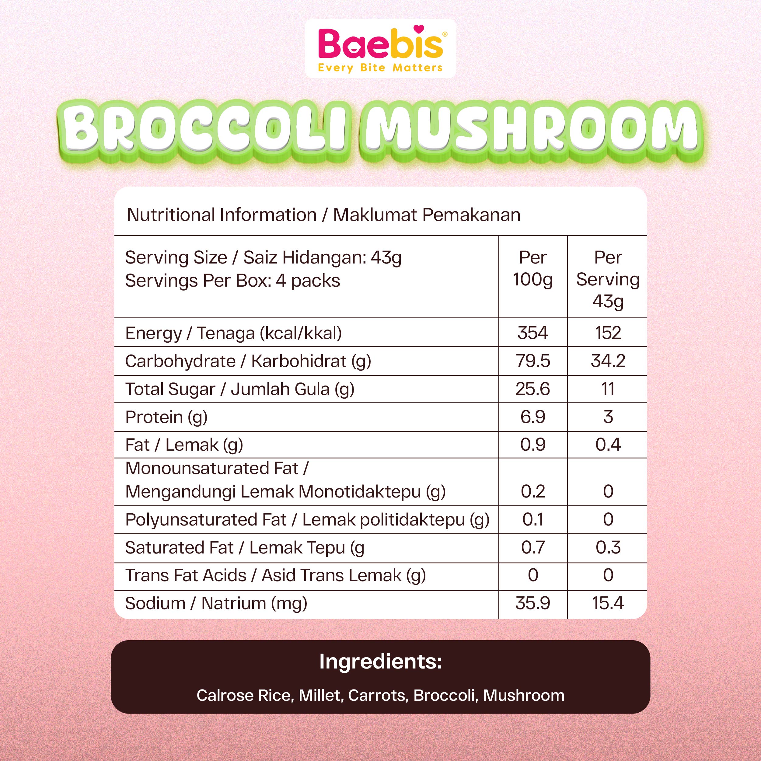 - Serving Size : 44g (1 pack) with 4 packs of ingredients (Calrose rice, millet, broccolli, mushroom and carrot cube)