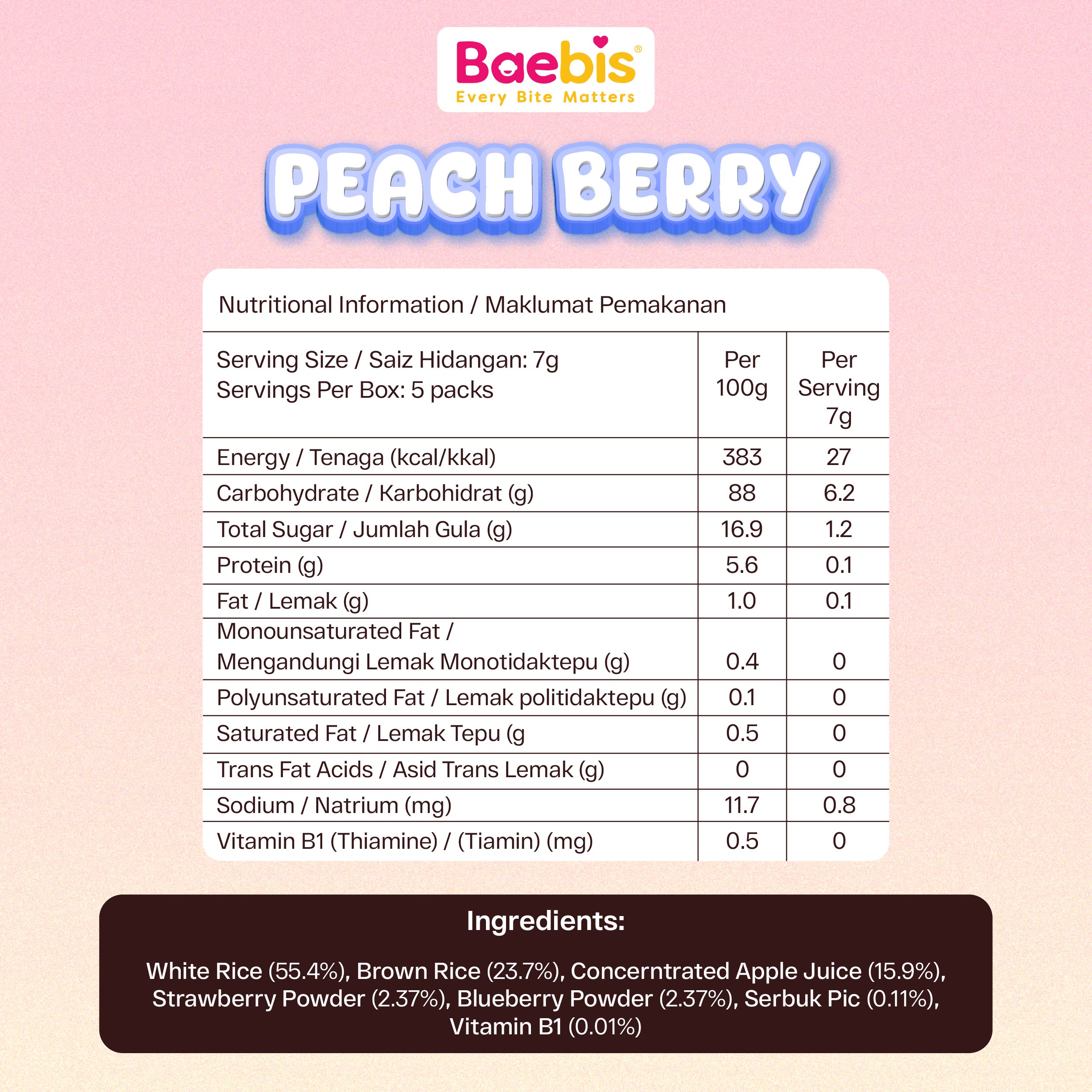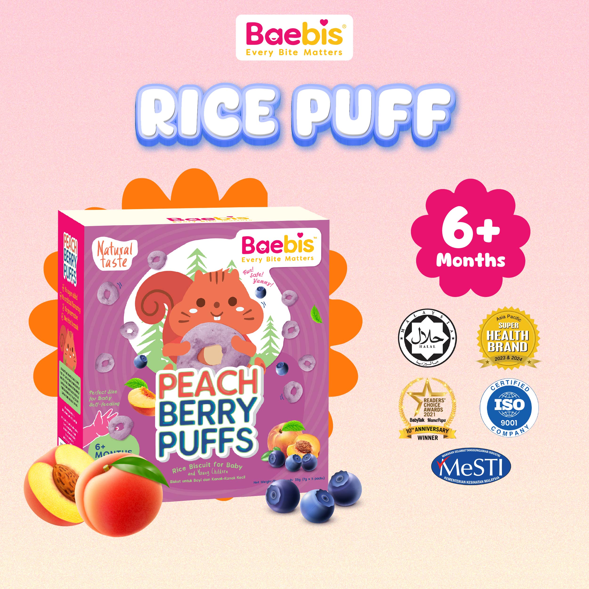 - BAEBIS WORLD understand your concern and we have blended our organic pureed berries and peach into rice puff so your babies can enjoy the nutritious puffs with no worries.